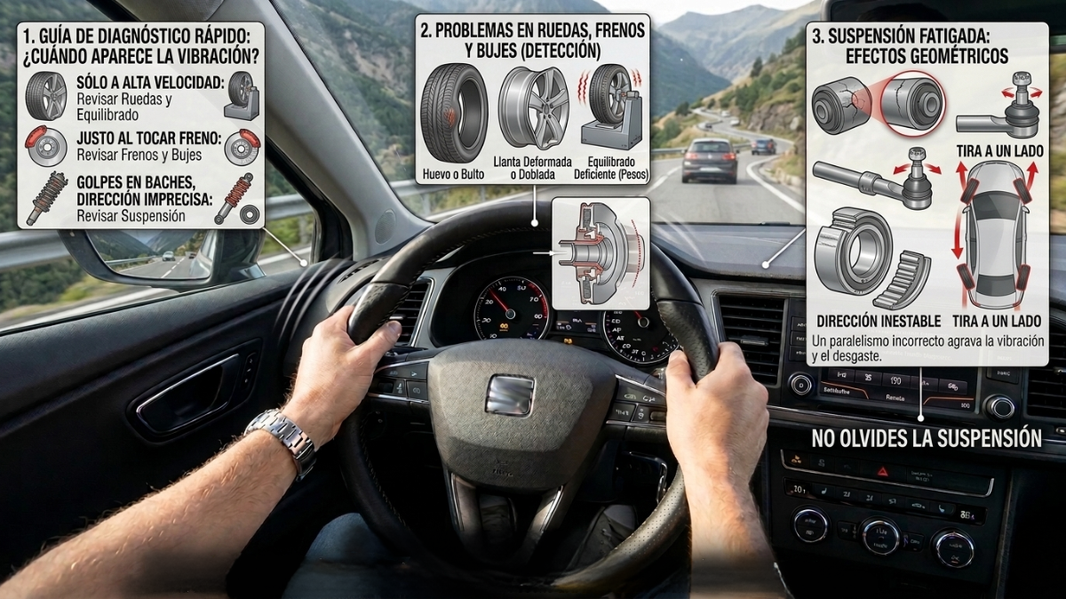 ¿La pista definitiva? Observa cuándo sucede. Si solo aparece a alta velocidad, mira primero ruedas y equilibrado. Si aparece justo al tocar el freno, piensa en frenos y bujes. Si además hay golpes en baches o dirección imprecisa, revisa suspensión. Con frenos no se improvisa. Ante vibraciones persistentes, lo prudente es una inspección: medir espesor de discos, comprobar descentramiento, revisar pinzas y guías, mirar neumáticos y holguras. La buena noticia es que casi siempre tiene solución clara. La mala es ignorarlo: un coche que vibra al frenar te roba control justo cuando más lo necesitas.